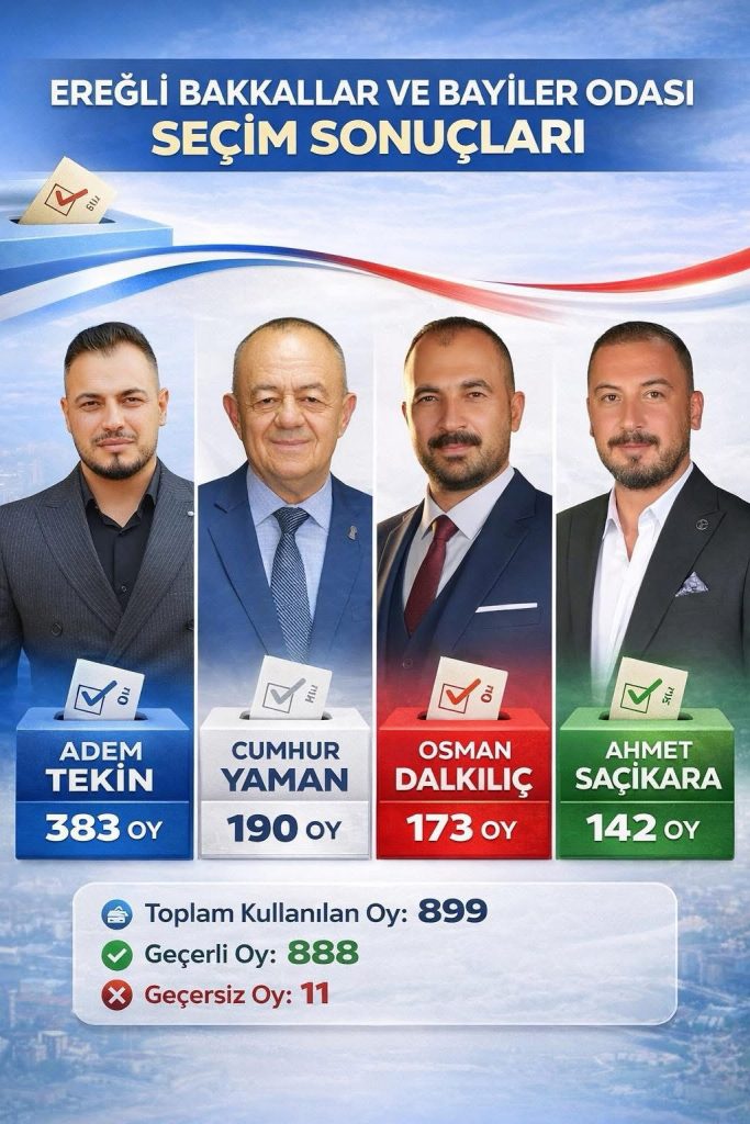 Saat 17.00 itibarıyla sandıkların açılmasının ardından yapılan sayım sonucunda, mavi pusula ile yarışan Adem Tekin en fazla oyu alarak Ereğli Bakkallar ve Bayiler Odası Başkanlığına seçildi.